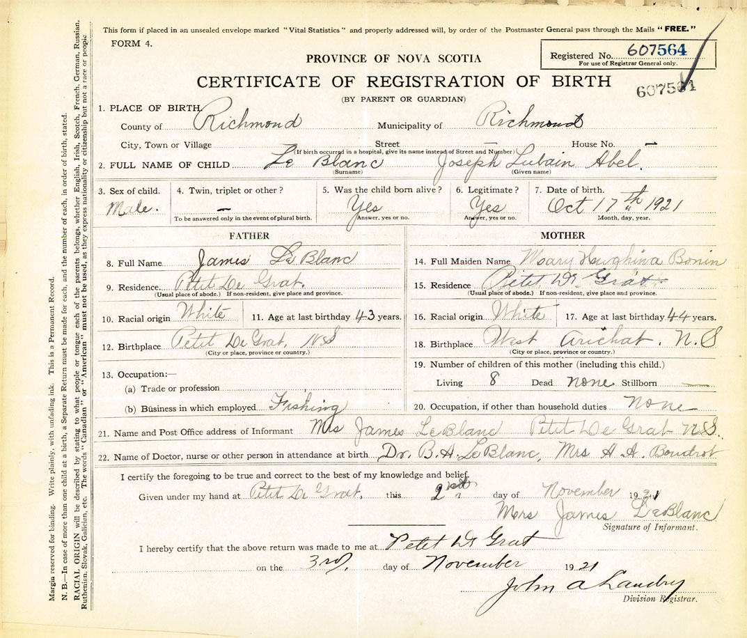 21. Name and Post Office address of Informant Mrs. James LeBlanc Petit-de-Grat
