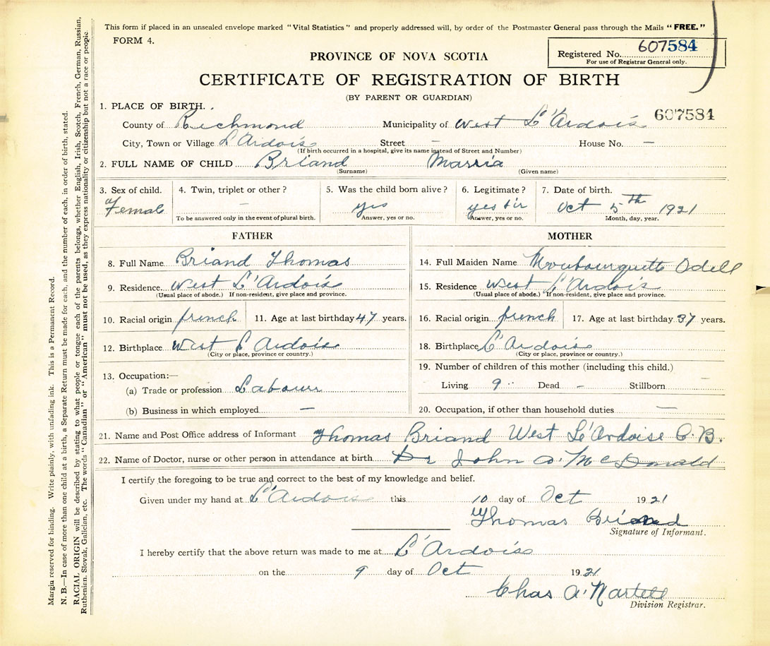 21. Name and Post Office address of Informant Thomas Briand West L'Ardoise, Cape Breton