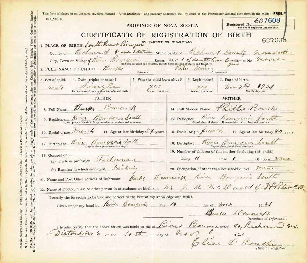 22. Name of Doctor, nurse or other person in attendance at birth Dr. J. A. McDonald of St. Peter's, C.B.
