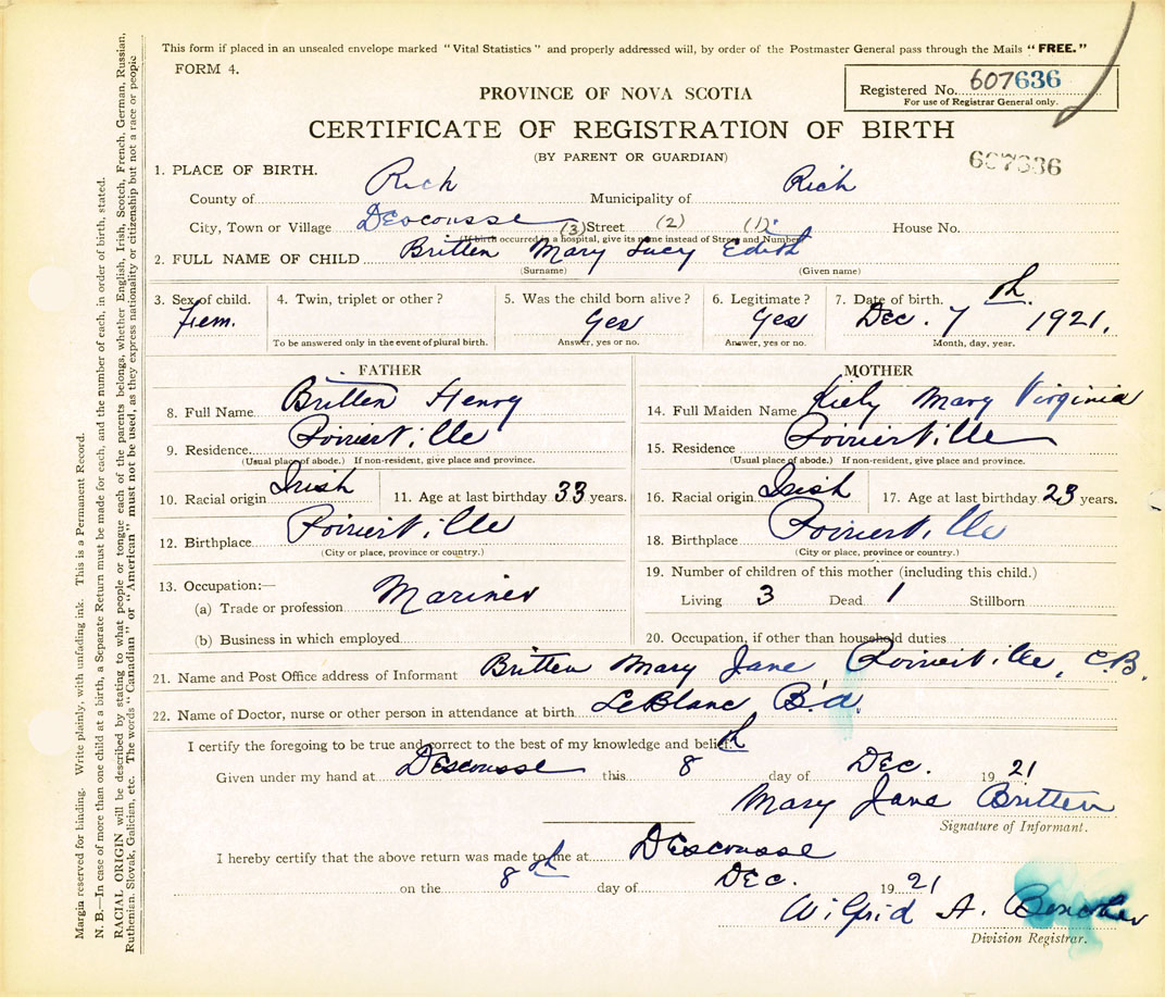 21. Name and Post Office address of Informant Mary Jane Britten Poirier Ville, C.B.