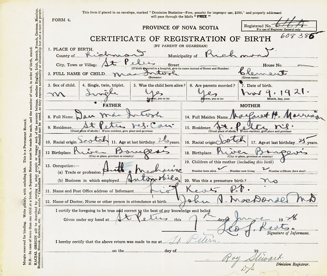 22. Name of Doctor, nurse or other person in attendance at birth John A. MacDonald M.D.