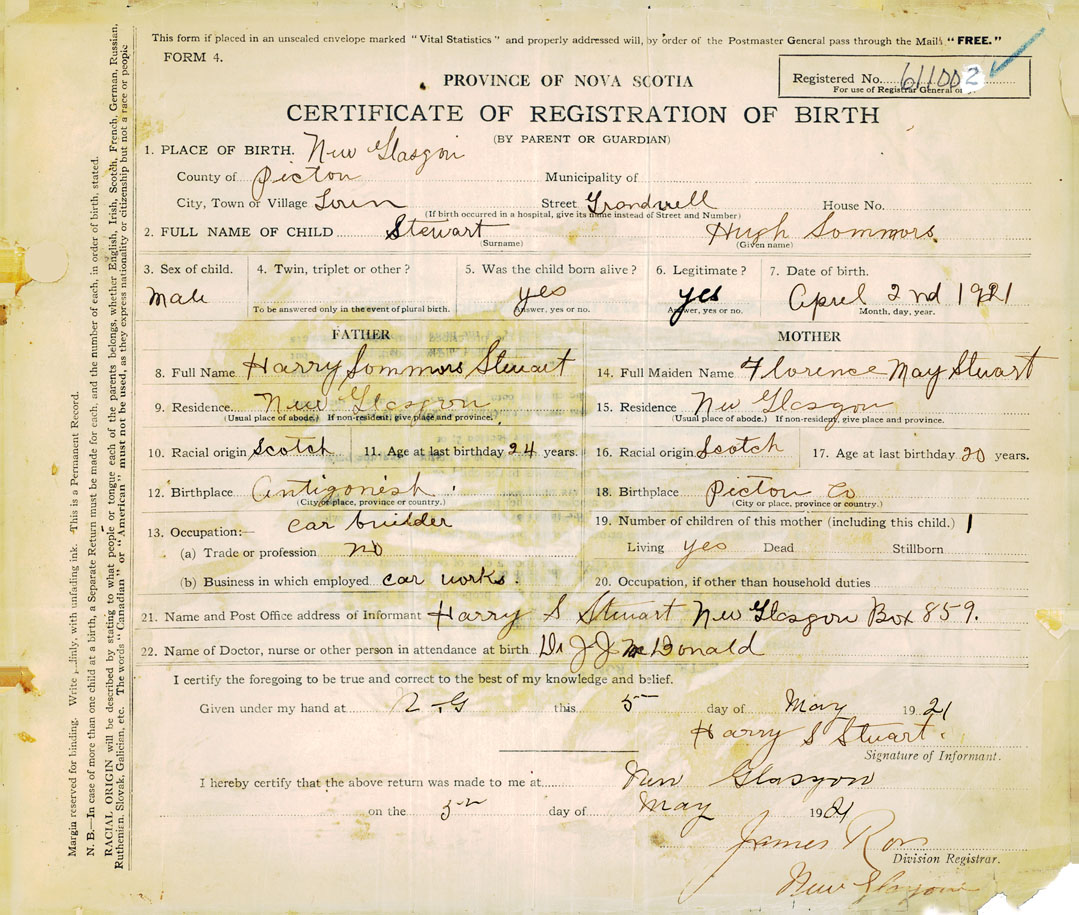 21. Name and Post Office address of Informant Harry S. Stewart New Glasgow Box 859