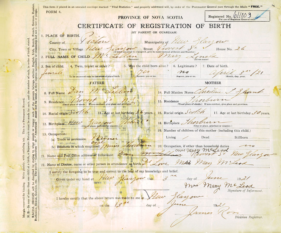 21. Name and Post Office address of Informant Mrs. Mary McLeod Provost St., New Glasgow
