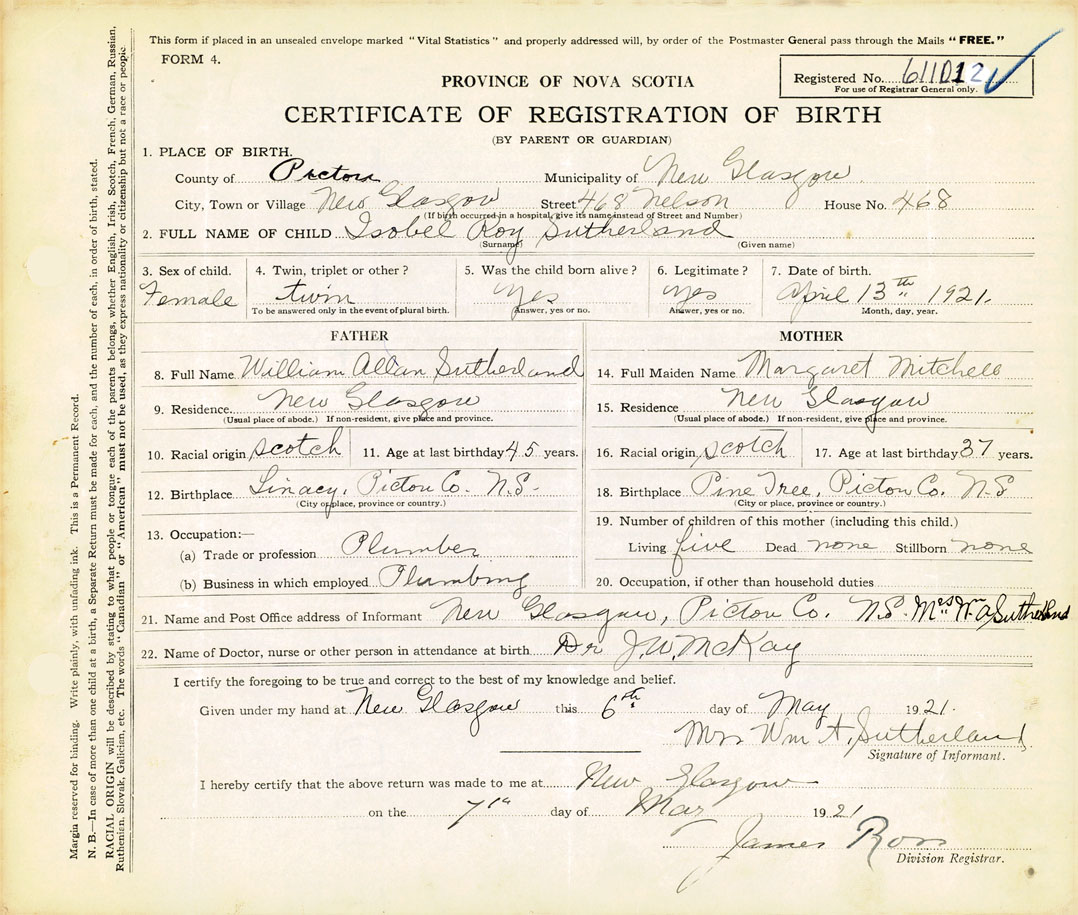 21. Name and Post Office address of Informant Mrs. William Sutherland New Glasgow, Pictou Co., NS