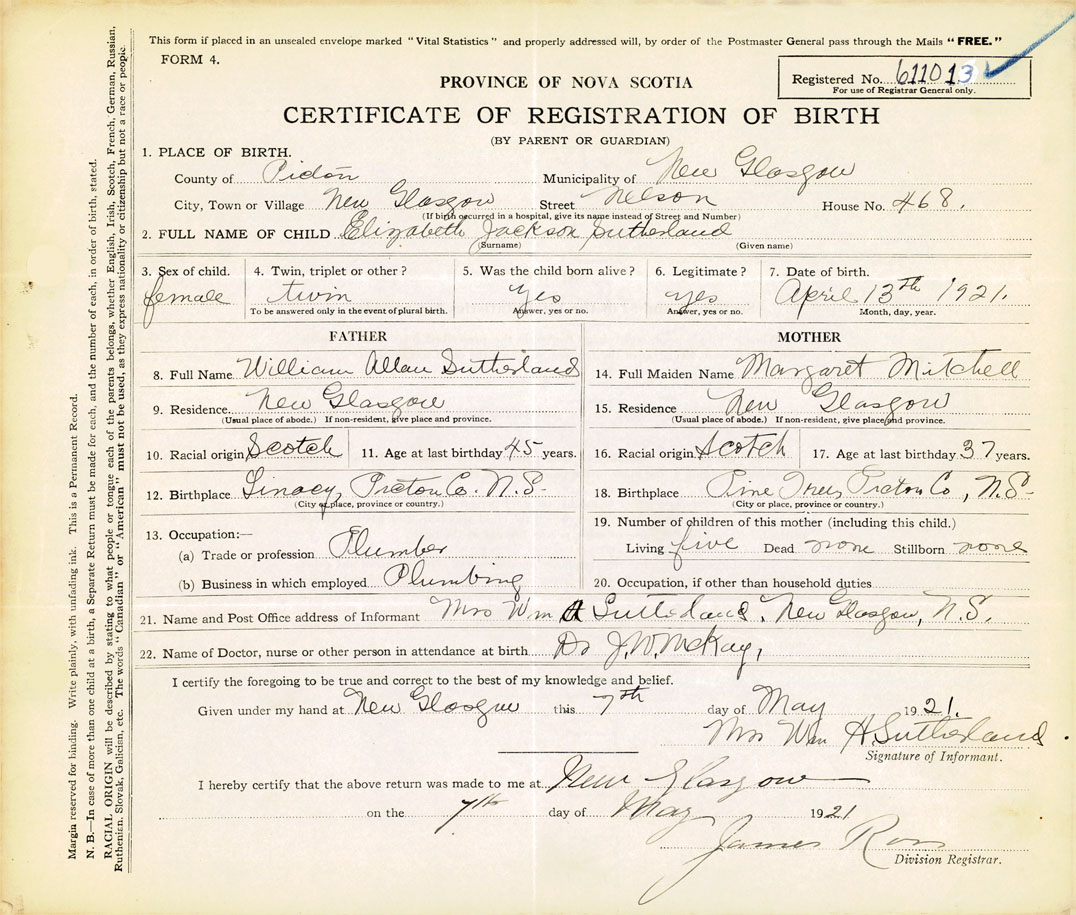 21. Name and Post Office address of Informant Mrs. William A. Sutherland New Glasgow, Pictou Co., NS