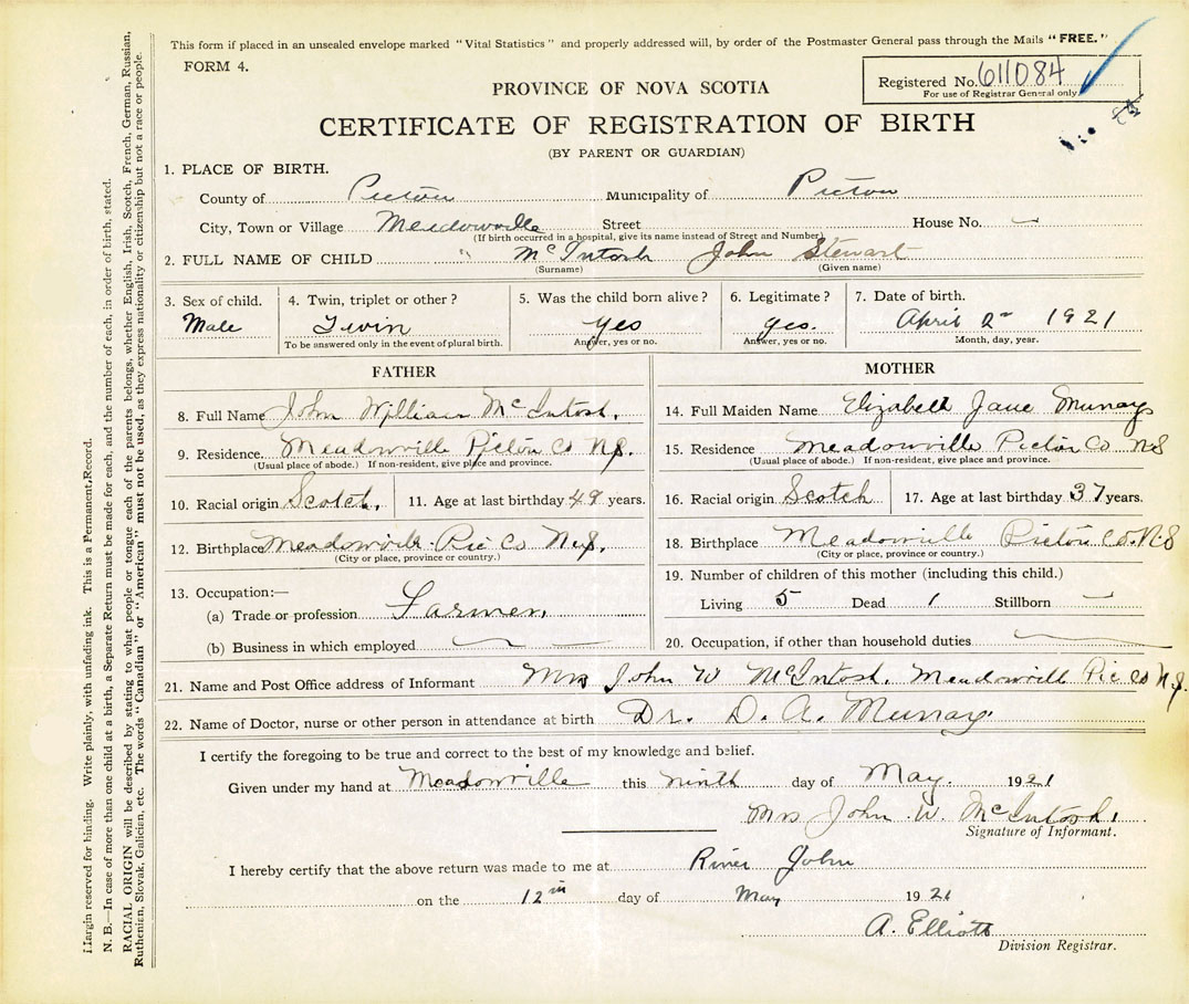 21. Name and Post Office address of Informant Mrs. John W. McIntosh Meadowville, Pictou County, N.S.