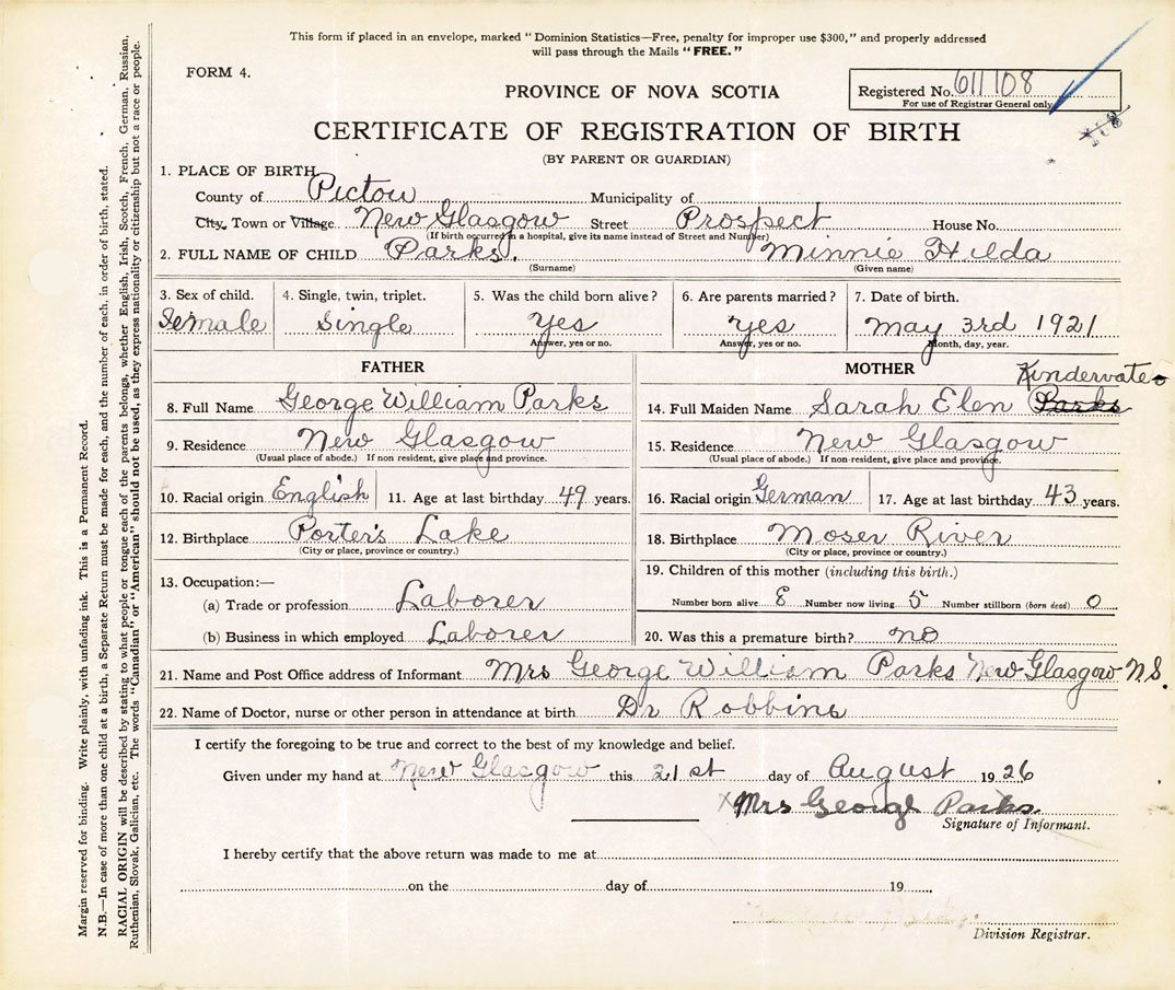 21. Name and Post Office address of Informant Mrs. George William Parks New Glasgow, N.S.