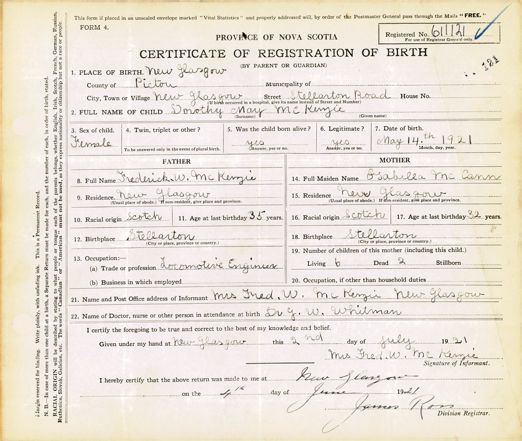21. Name and Post Office address of Informant Mrs. Fred W. McKenzie New Glasgow