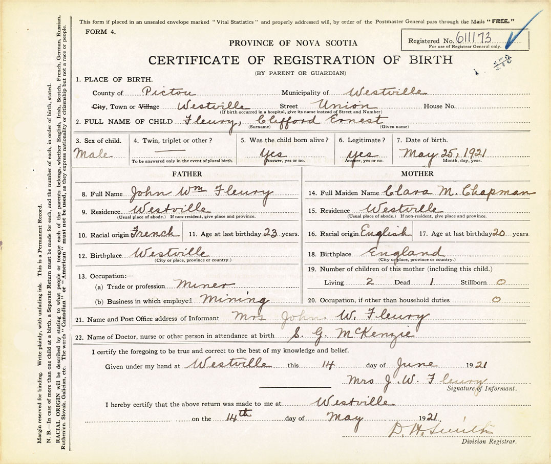 2. FULL NAME OF CHILD Fleury, Clifford Ernest