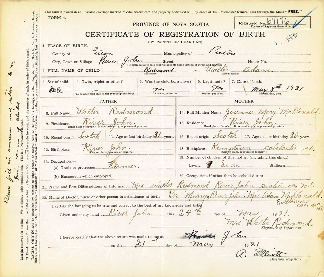 21. Name and Post Office address of Informant Mrs. Walter Redmond River John Pictou co. N.S.