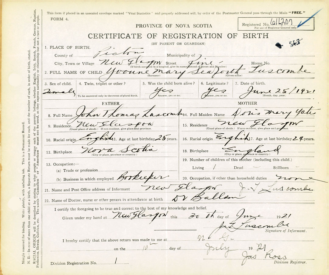 2. FULL NAME OF CHILD Luscombe, Yvonne Mary Seaforth