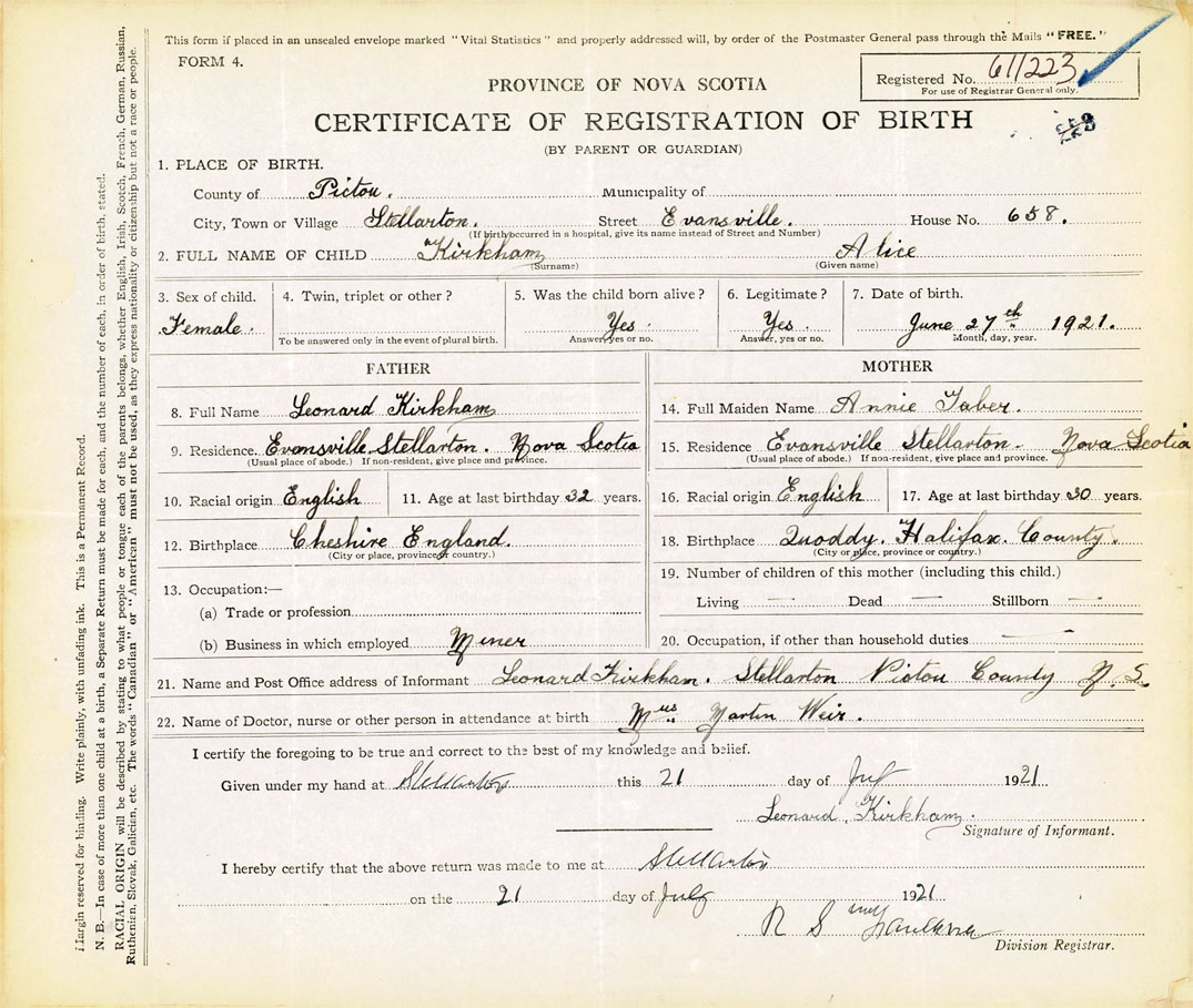 21. Name and Post Office address of Informant Leonard Kirkham Stellarton, Pictou County