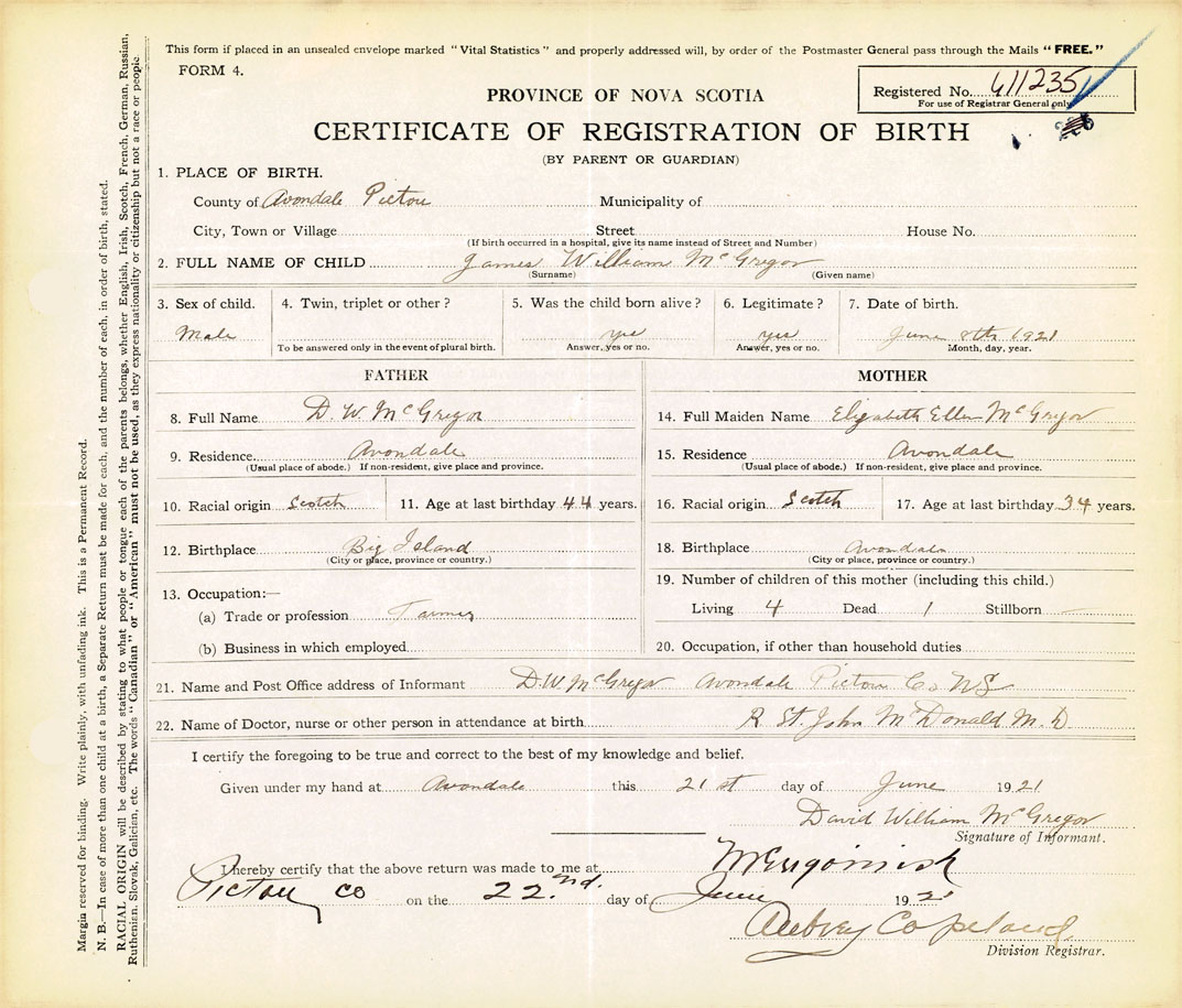 21. Name and Post Office address of Informant David William McGregor Avondale, Pictou