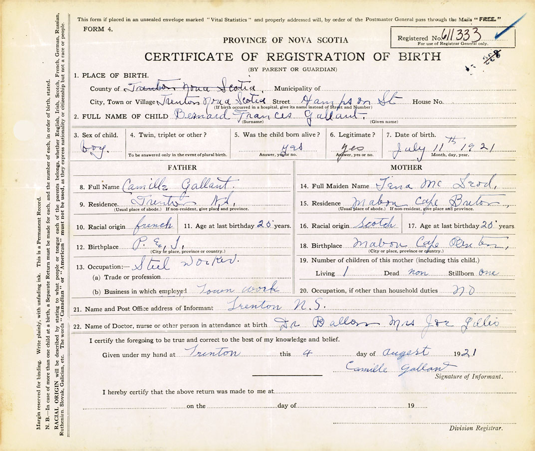 2. FULL NAME OF CHILD Gallant, Bernard Frances