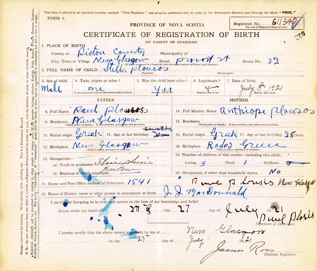 21. Name and Post Office address of Informant Paul Plousios New Glasgow