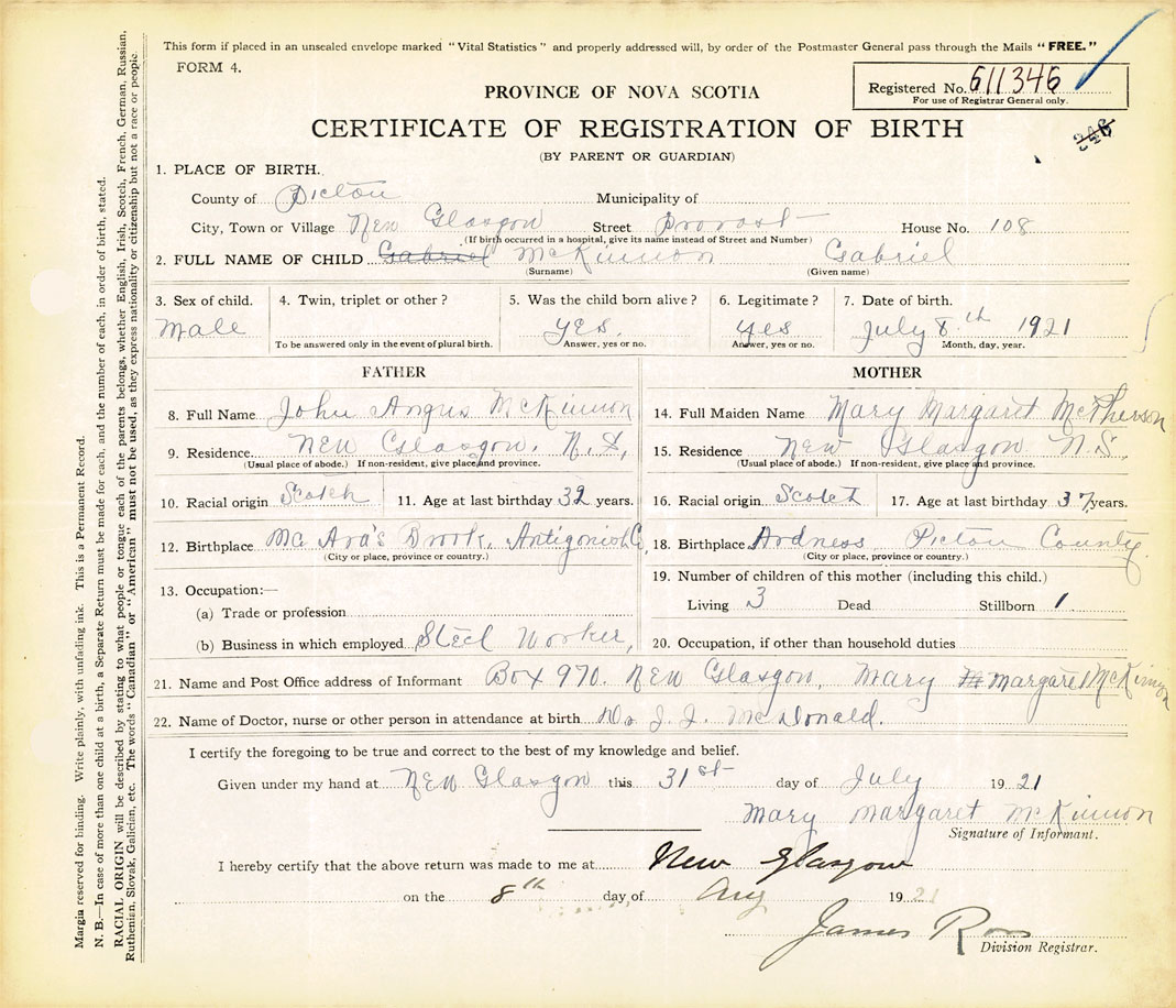 21. Name and Post Office address of Informant Mary Margaret McKinnow Box 970, New Glasgow
