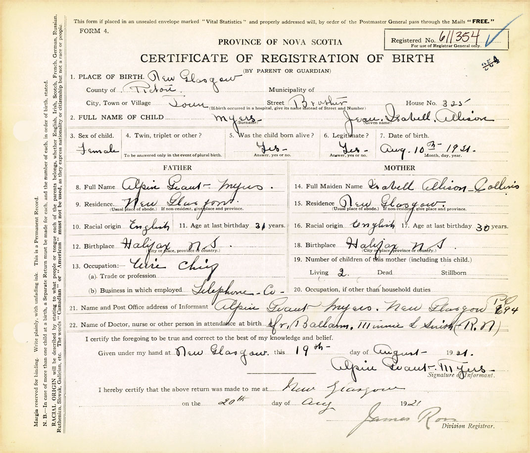 21. Name and Post Office address of Informant Alpin Grant-Myers New Glasgow PO 994
