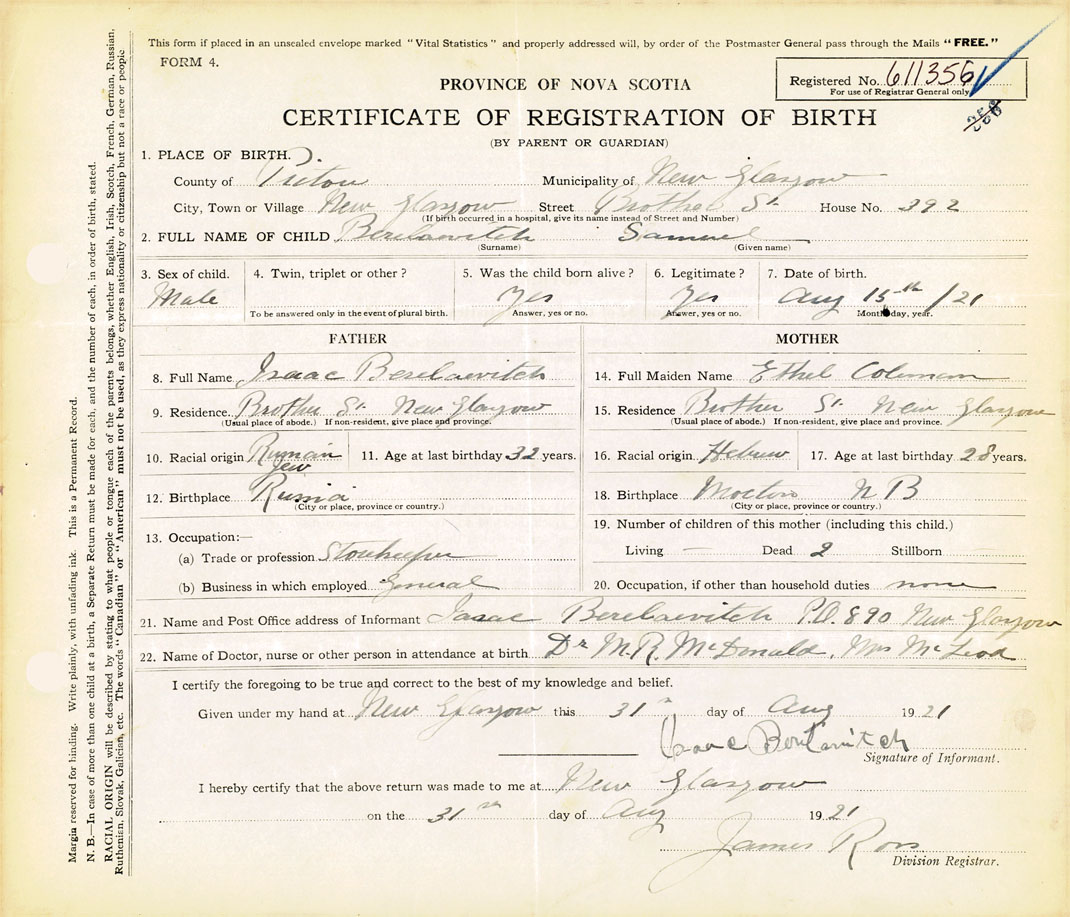 21. Name and Post Office address of Informant Isaac Berelaevitch PO 890 New Glasgow N.S.