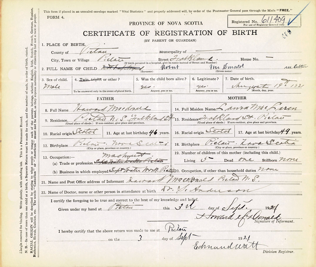 21. Name and Post Office address of Informant Howard MacDonald Pictou, N.S.