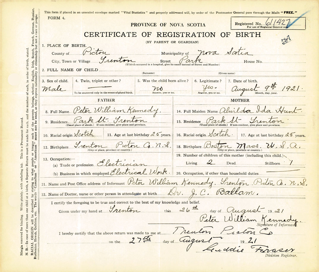 21. Name and Post Office address of Informant Peter William Kennedy Trenton, Pictou