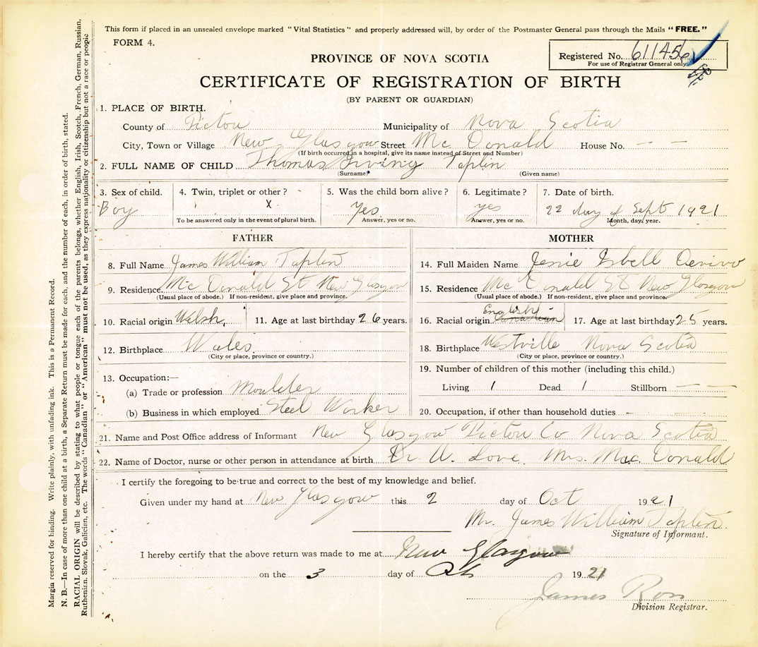 21. Name and Post Office address of Informant Mr. James William Taplin New Glasgow, Pictou