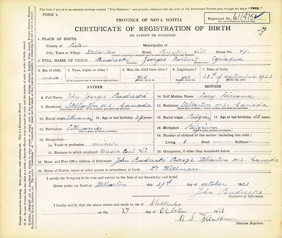 21. Name and Post Office address of Informant John Budreski Box 672 Stellarton N.S. Canada