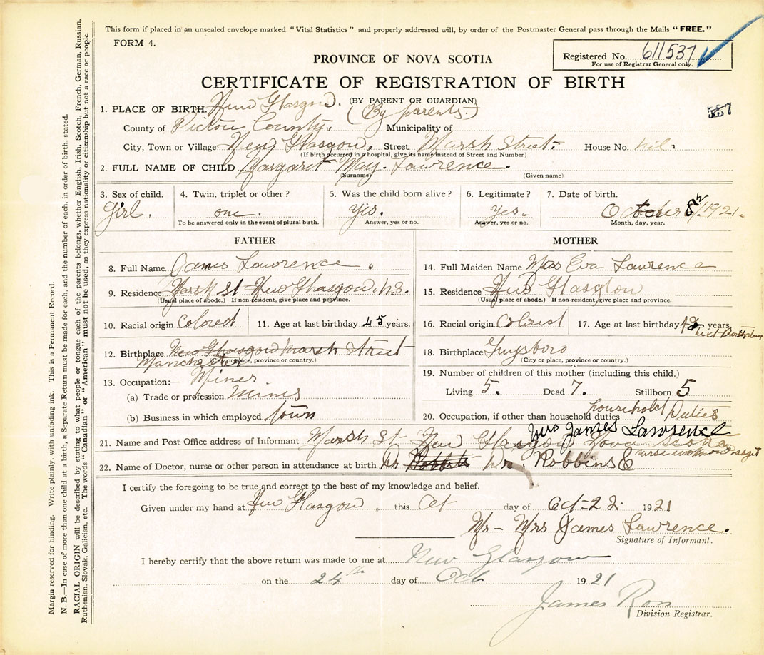 21. Name and Post Office address of Informant Mrs. James Lawrence Marsh St., New Glasgow