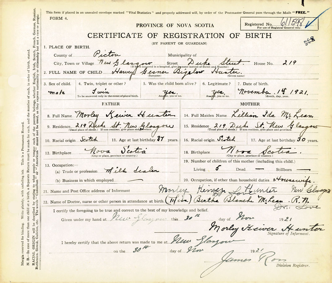 21. Name and Post Office address of Informant Morley Keiver Hunter New Glasgow