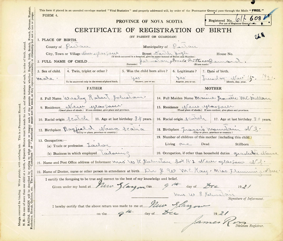 21. Name and Post Office address of Informant Mrs. W. R. Johnston Box 152 New Glasgow