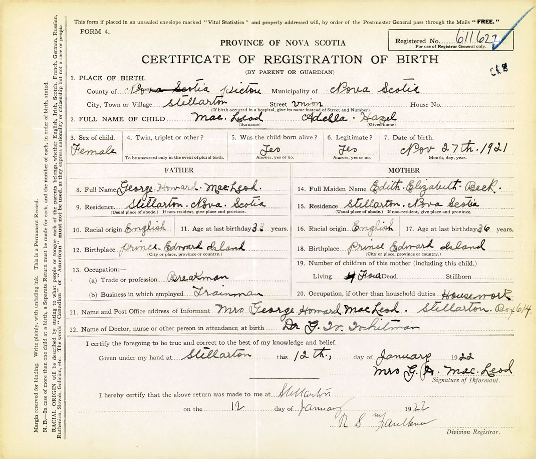 21. Name and Post Office address of Informant Mrs. George Howard MacLeod Stellarton, Box 614