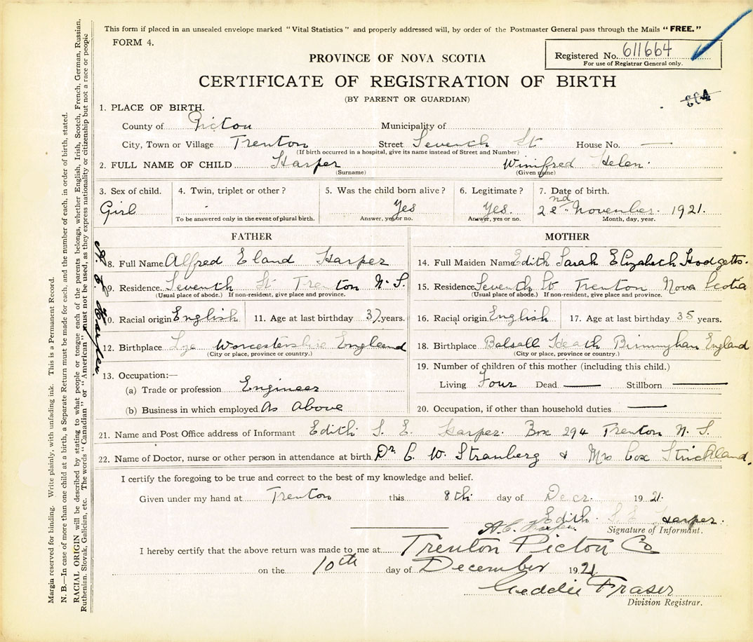 21. Name and Post Office address of Informant Edith S.E. Harper Box 294, Trenton, NS