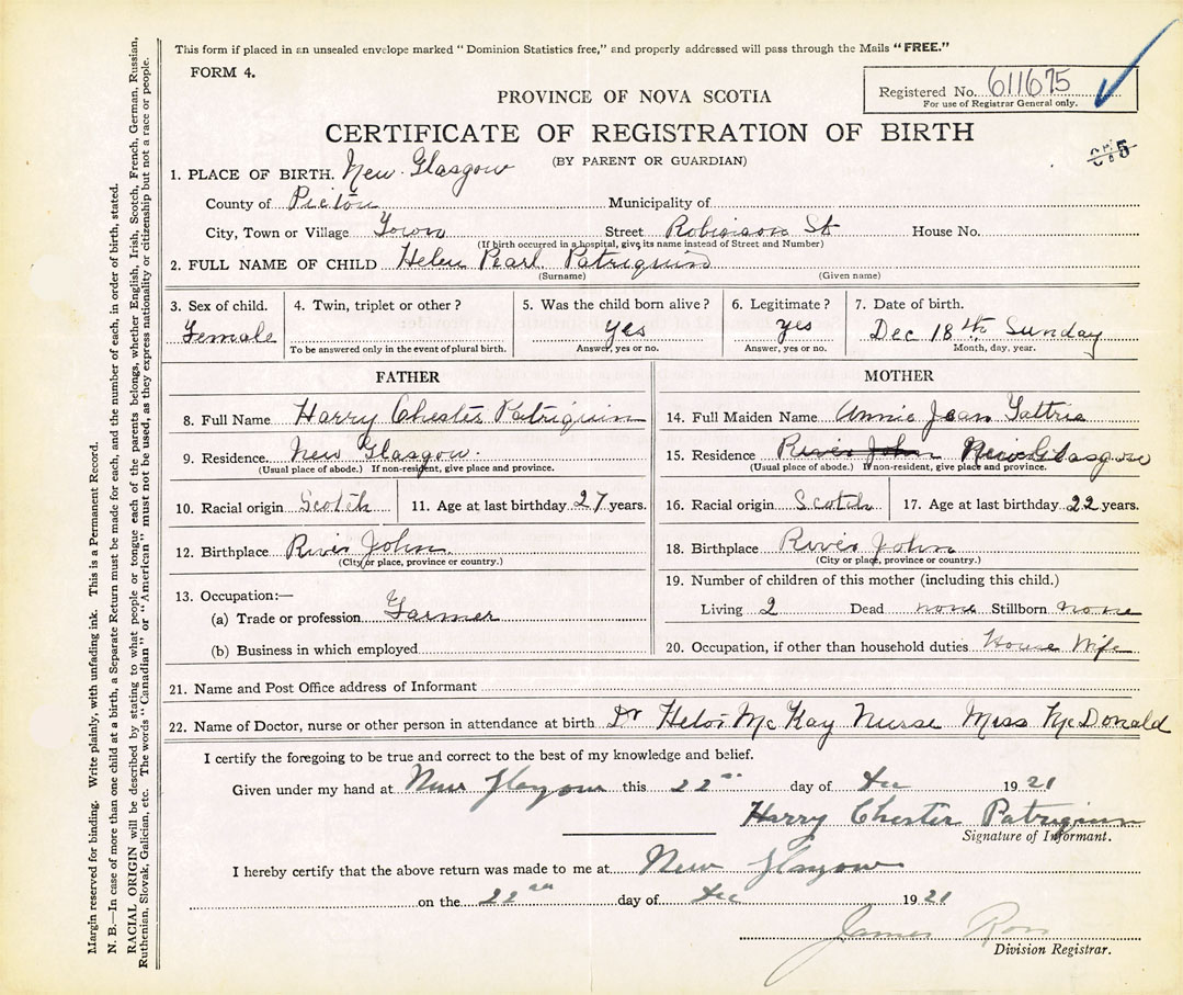 21. Name and Post Office address of Informant Harry Chester Patriquin Robinson Street, New Glasgow