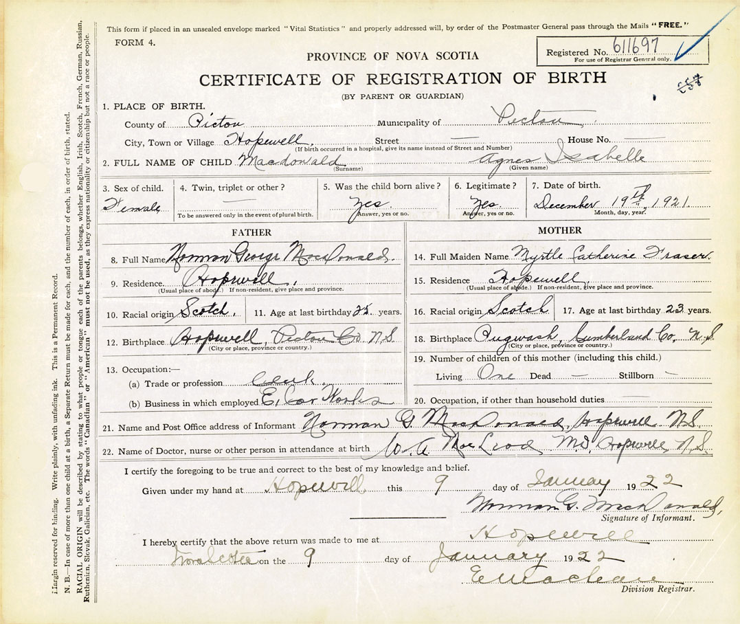22. Name of Doctor, nurse or other person in attendance at birth W.A. MacLeod, M.D., Hopewell, N.S.