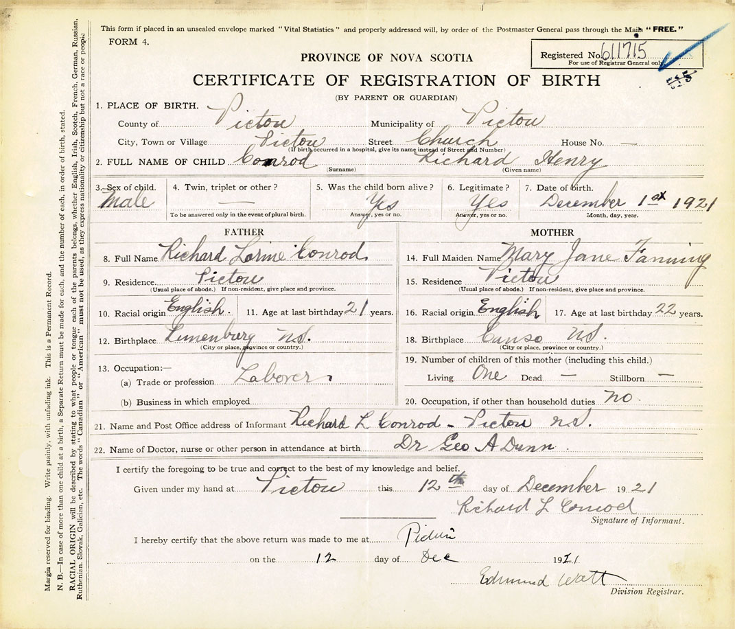 21. Name and Post Office address of Informant Richard L Conrod Pictou, NS