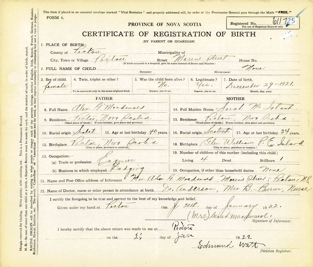 21. Name and Post Office address of Informant Mrs. Alex G. Macdonald Marine Street, Pictou, N.S.
