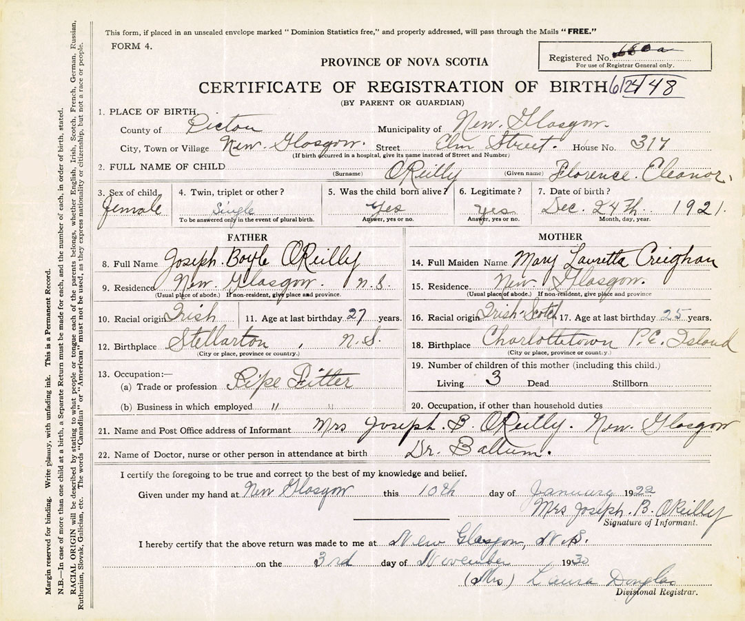 21. Name and Post Office address of Informant Mrs Joseph B OReilly New Glasgow