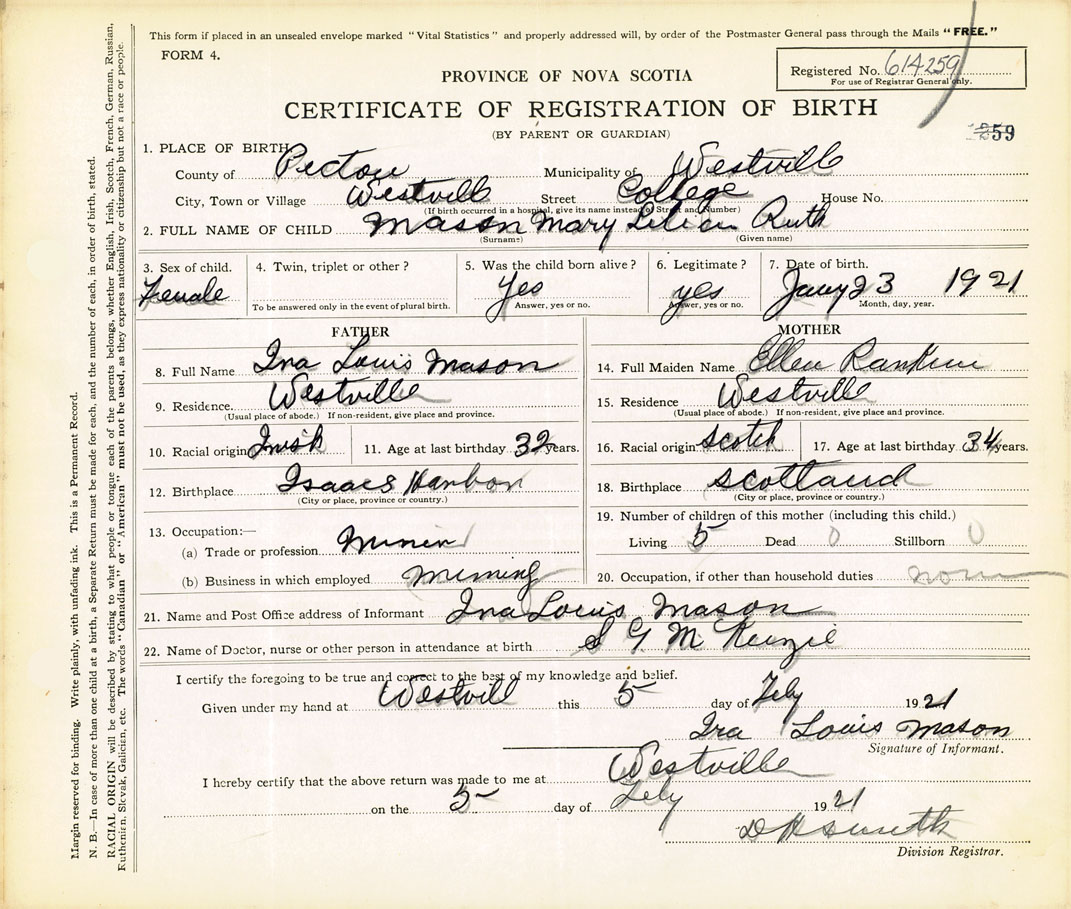 21. Name and Post Office address of Informant Ira Louis Mason College Street, Westville, N.S.