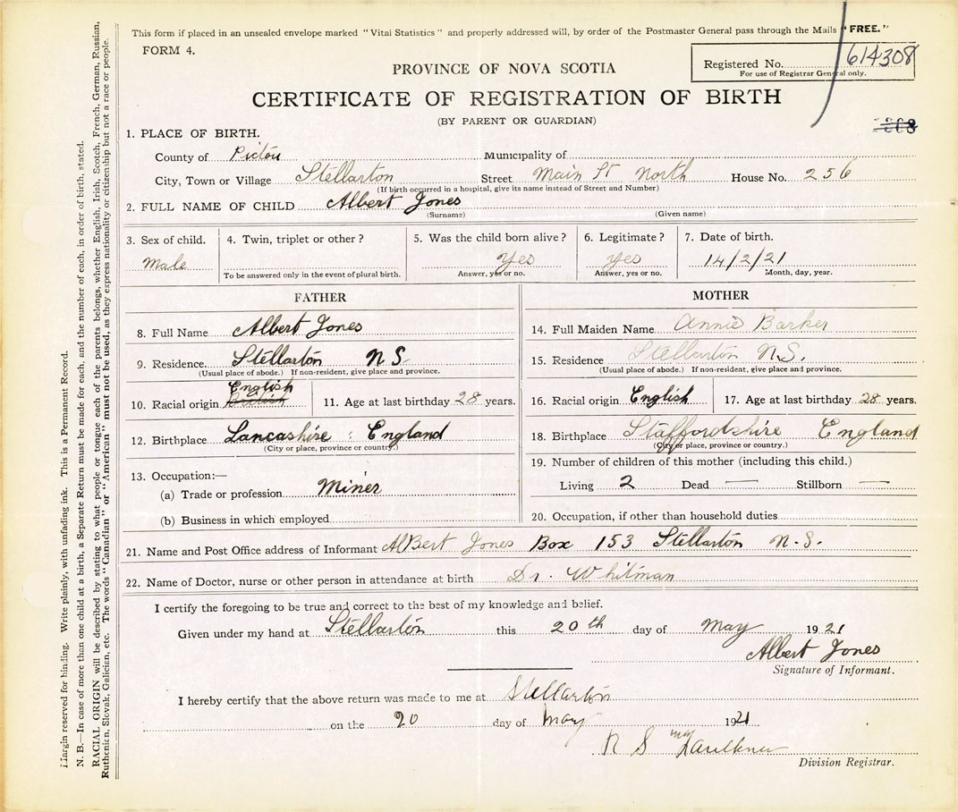 21. Name and Post Office address of Informant Albert Jones Box 153, Stellarton, NS