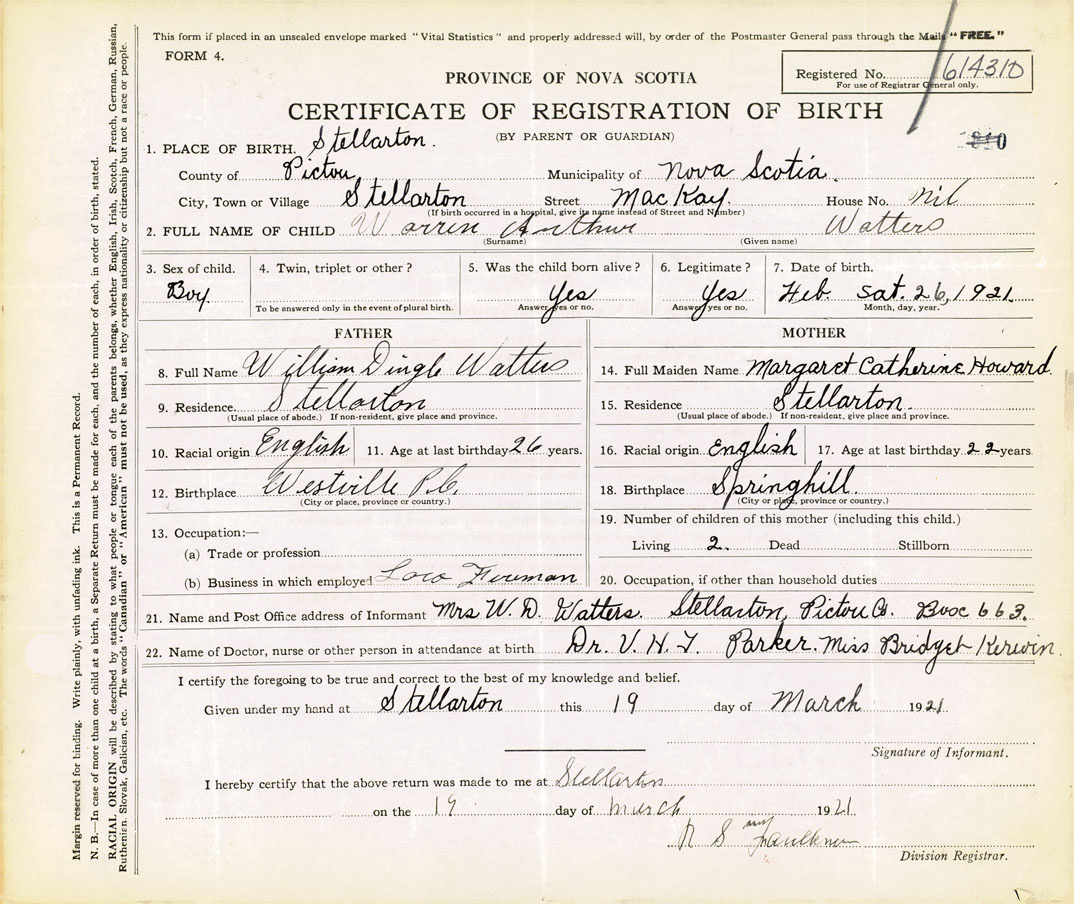 21. Name and Post Office address of Informant Mrs. W.D. Watters Stellerton, Pictou Box 663