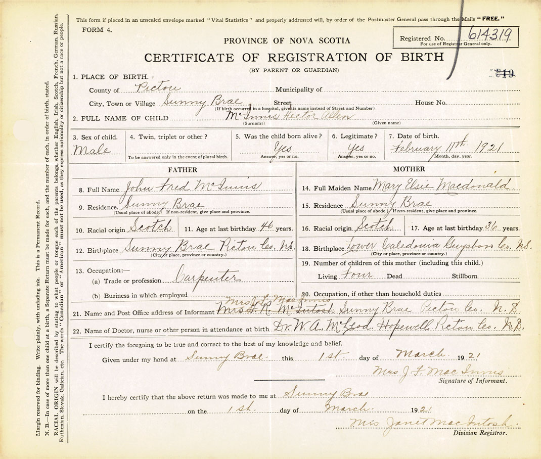 21. Name and Post Office address of Informant Mrs. J. F. MacInnis Sunnybrae, Pictou County, N.S.
