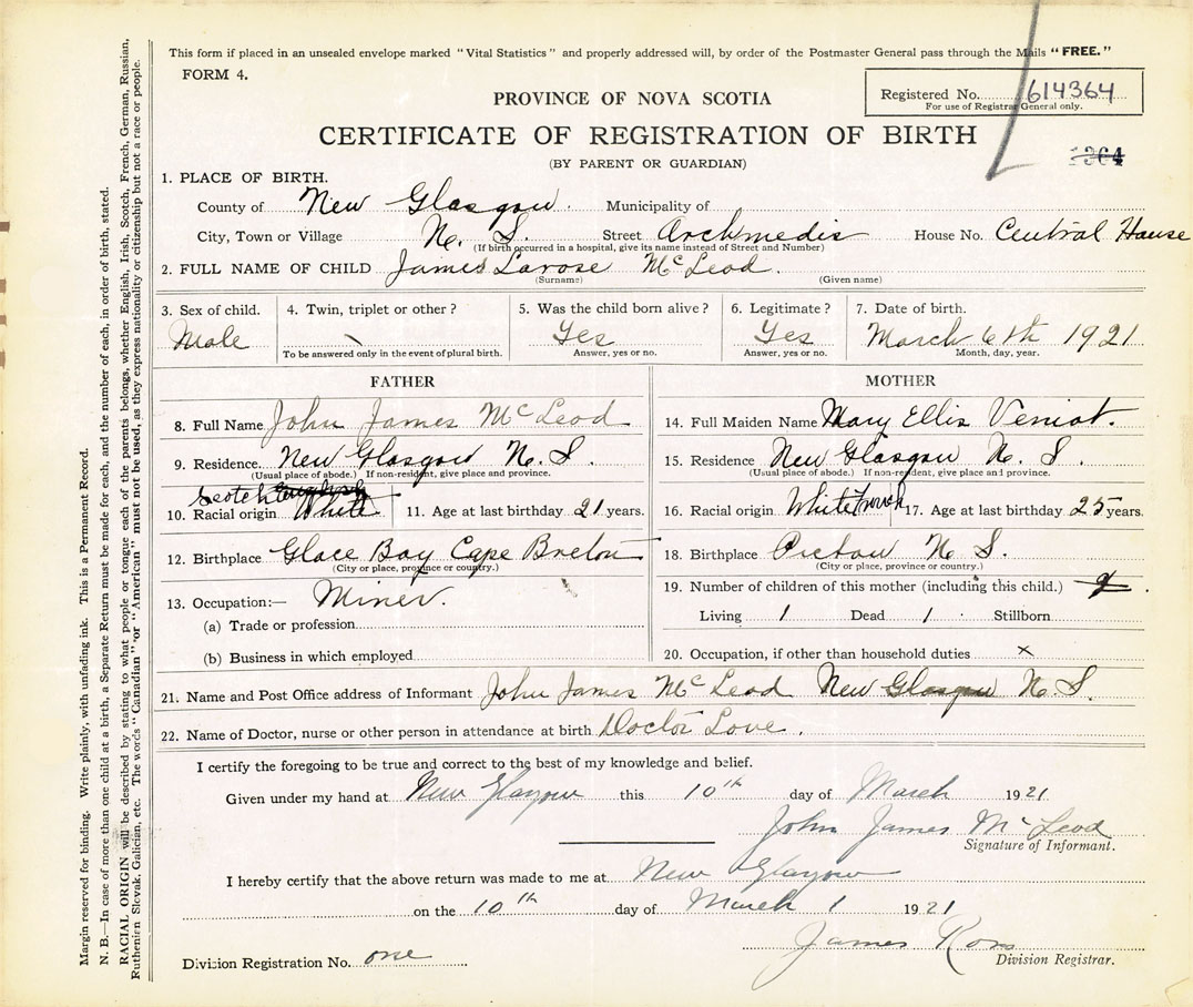 21. Name and Post Office address of Informant John James McLeod New Glasgow N.S.