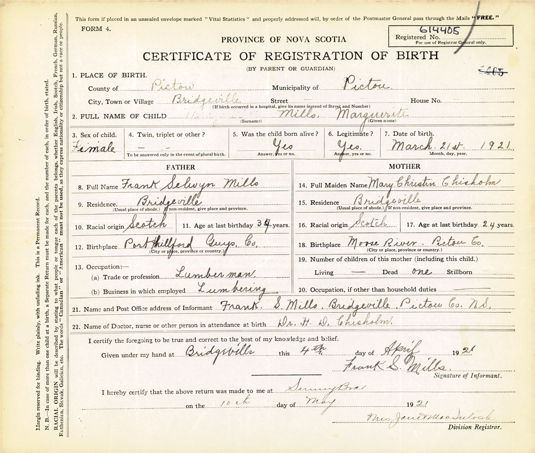 21. Name and Post Office address of Informant Frank S. Mills Bridgeville, Pictou, N.S.