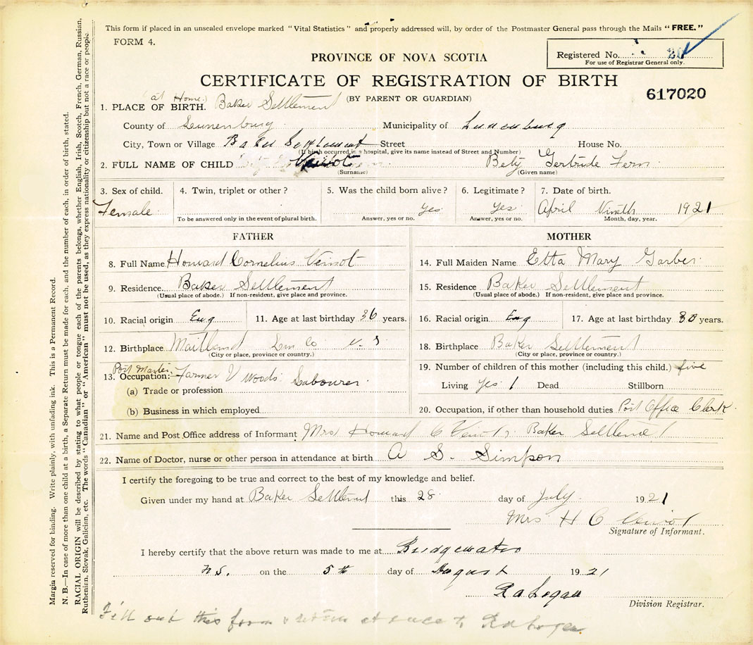 21. Name and Post Office address of Informant Mrs. Howard C. Veinot Baker Settlement