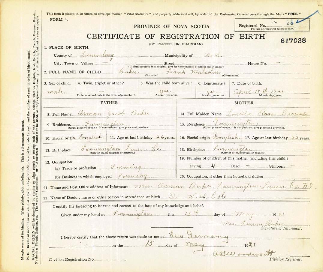 21. Name and Post Office address of Informant Mrs Orman Baker Farmington, Lunenburg County, Ns