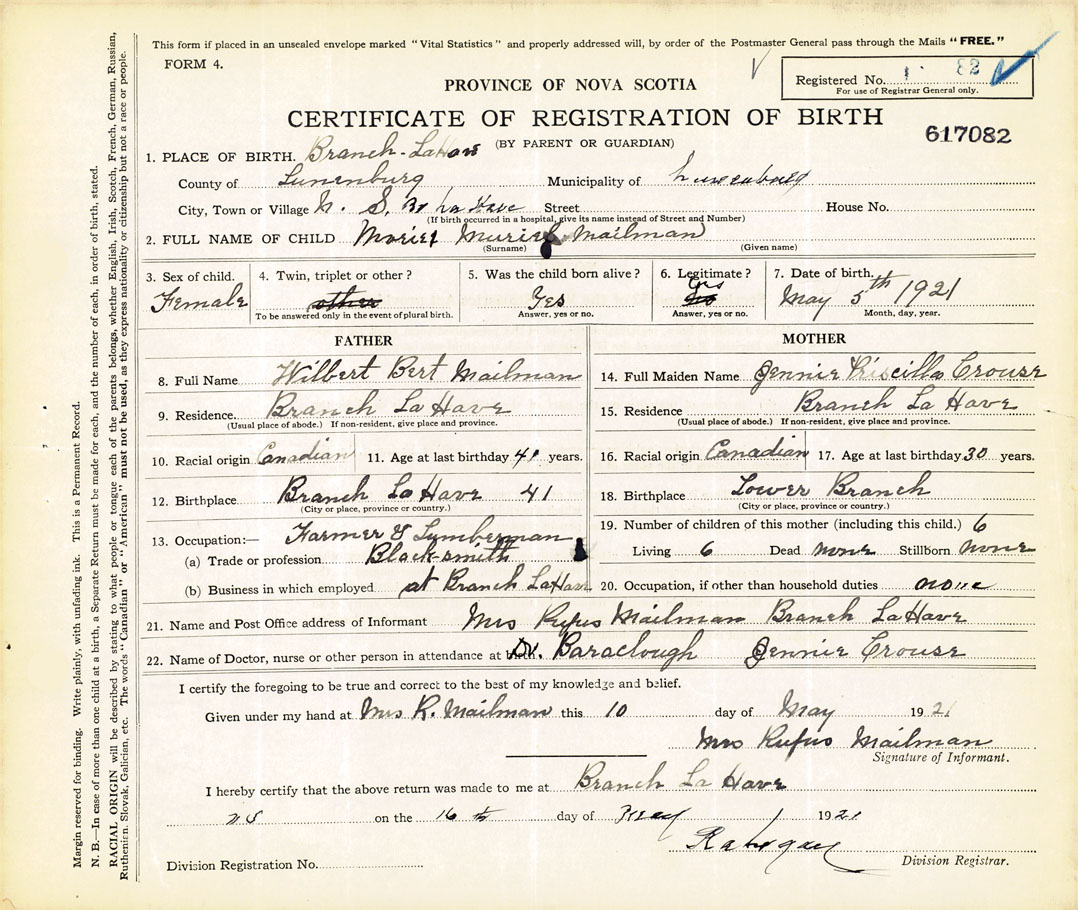 21. Name and Post Office address of Informant Mrs. Rufus Mailman Branch La Have