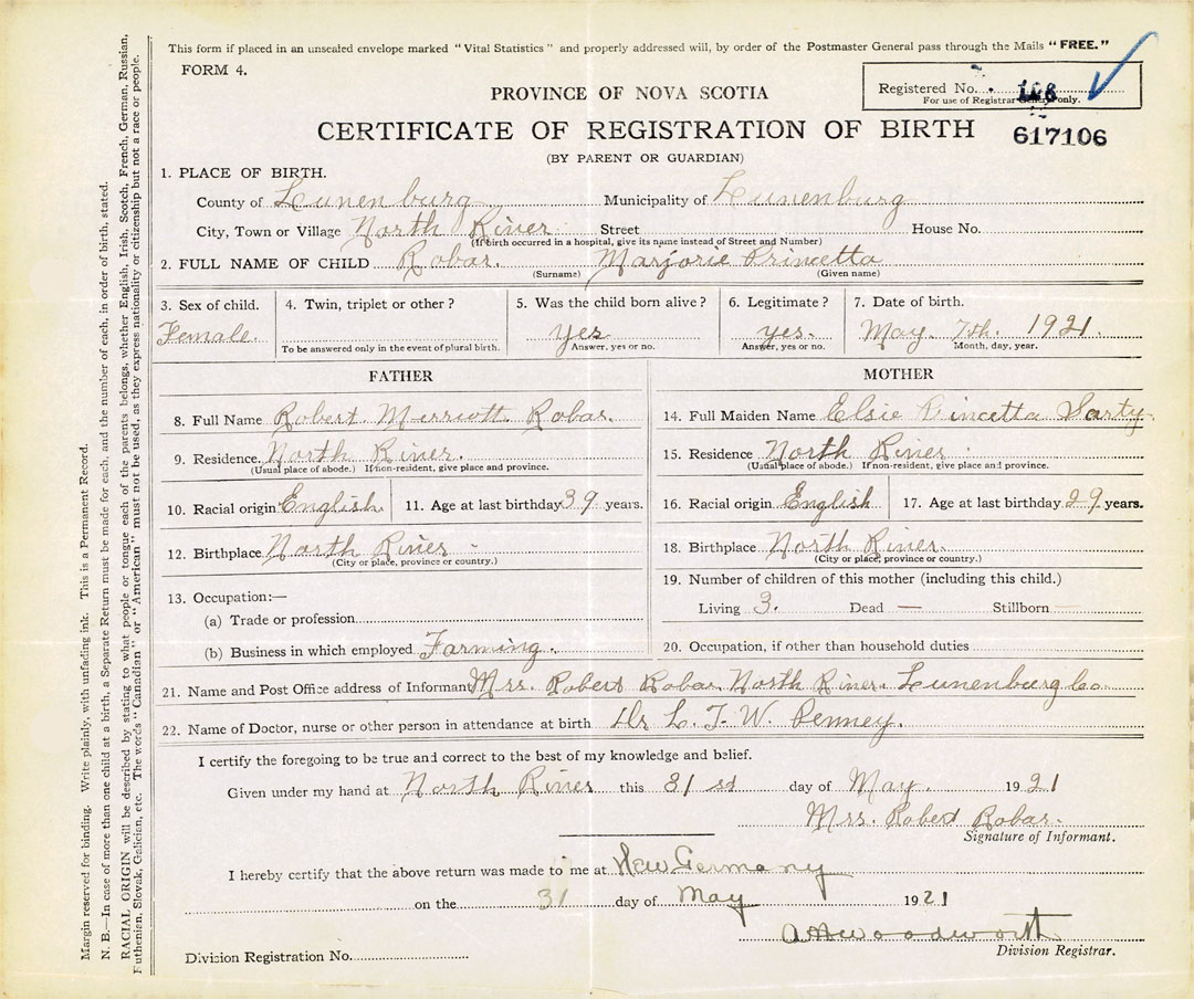 21. Name and Post Office address of Informant Mrs. Robert Robar North River, Lunenburg