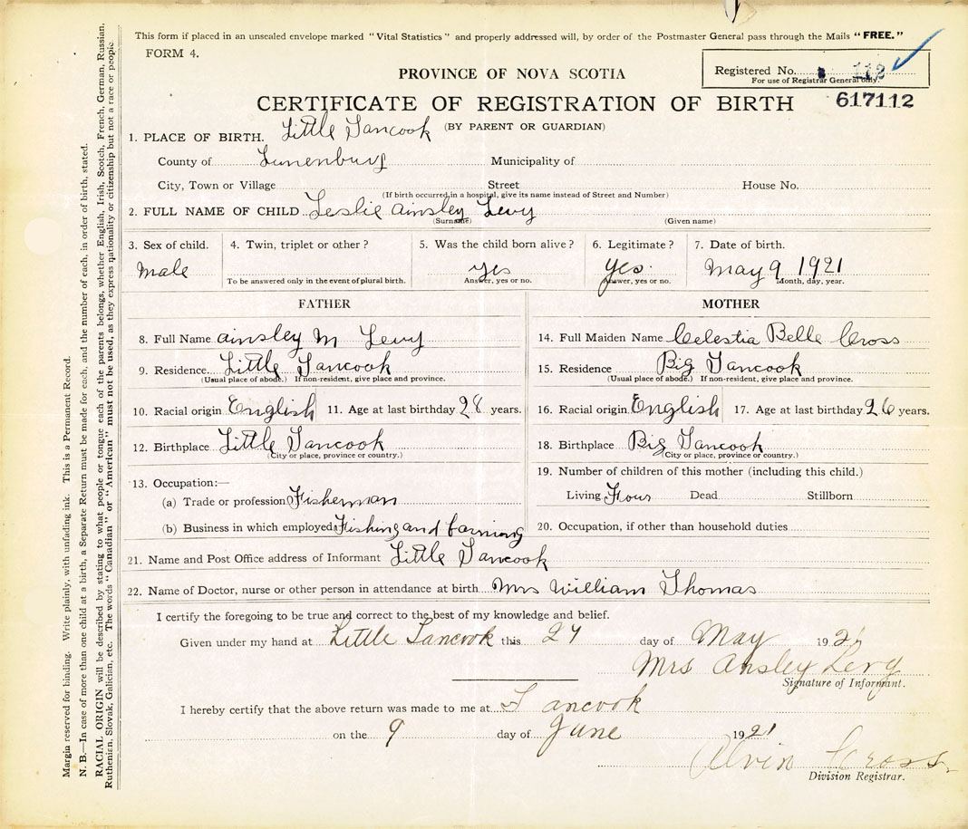 21. Name and Post Office address of Informant Mrs. Ainsley Levy Little Tancook