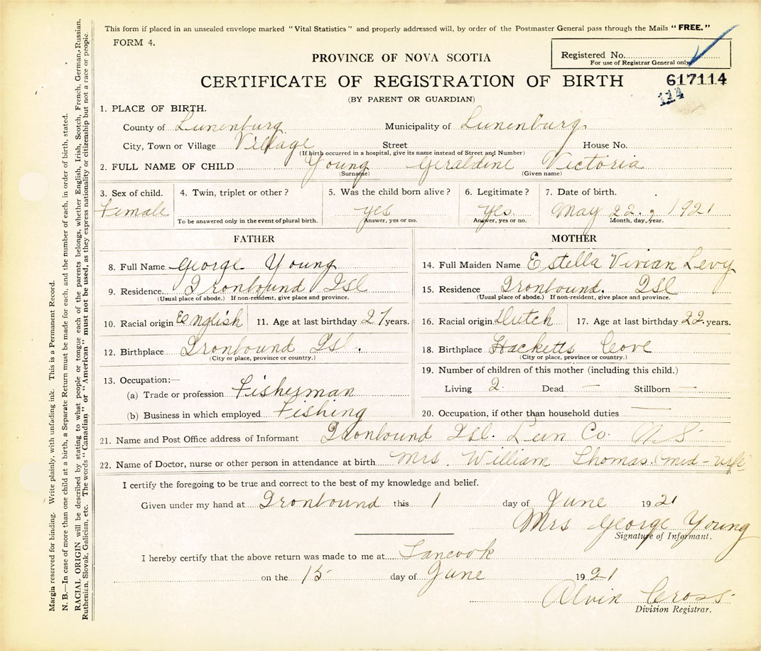 21. Name and Post Office address of Informant Mrs. George Young Ironbound Island, Lunenburg