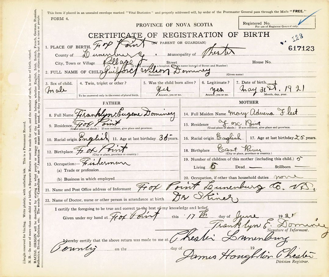 21. Name and Post Office address of Informant Franklyn E Dominey Fox Point Lunenburg N.S.