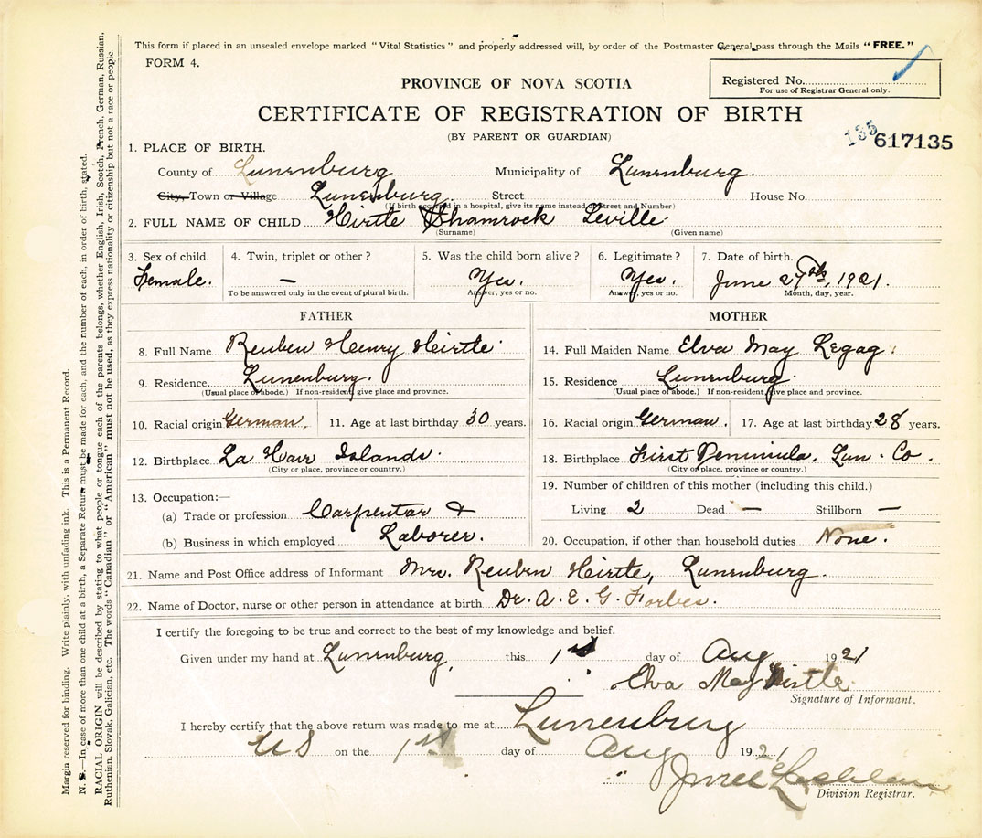 21. Name and Post Office address of Informant Mrs. Reuben Hirtle Lunenburg